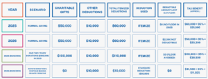 In 2025, there is no charitable deduction floor. Starting in 2026, however, the OBBA introduces a 0.5% charitable floor, meaning donations up to 0.5% of their adjusted gross income ($2,000) will not be deductible.